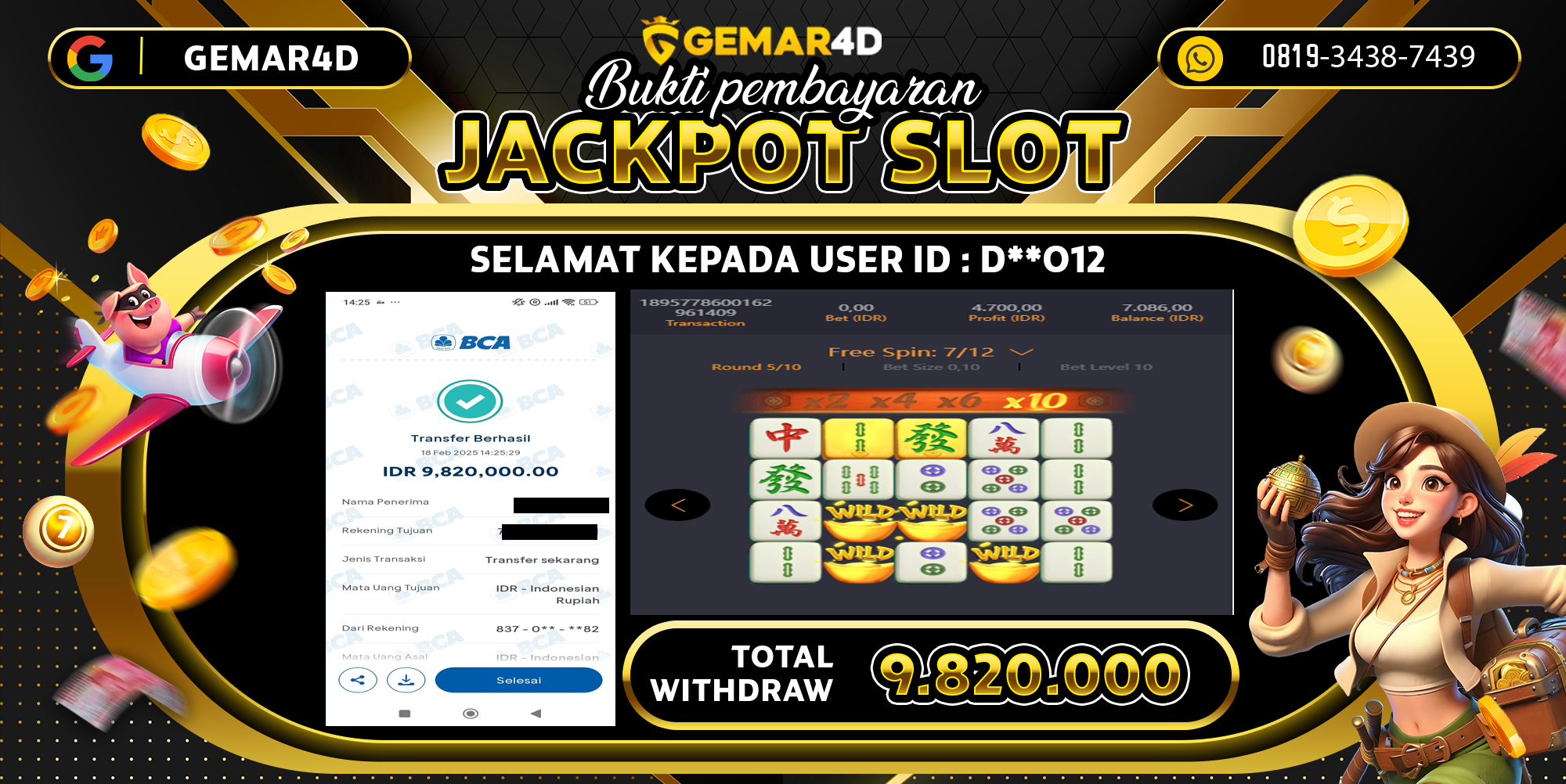 Selamat atas kemenangan User ID : D**O12, yang telah berhasil mendapatkan kemenangan di permainan SLOT MAHJONG WAYS dengan kemenangan sebesar Rp9.800.000,- . Setelah mengisi formulir withdraw, hanya dalam jangka waktu 2 – 5 menitan tim layanan pelanggan GEMAR4D telah berhasil mengirimkan semua saldo kemenangan ke User ID tersebut.