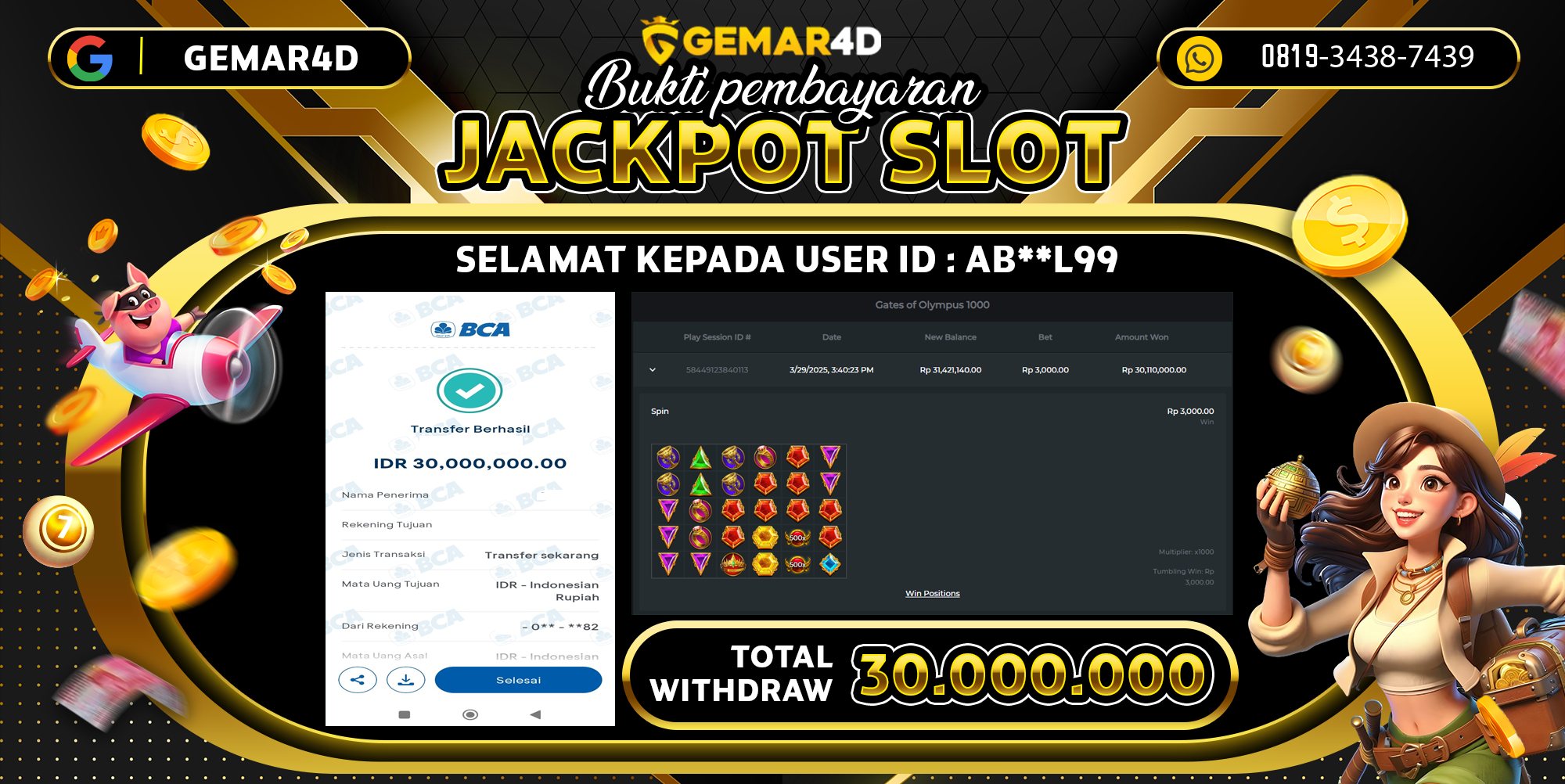 Selamat atas kemenangan User ID : AB**L99, yang telah berhasil mendapatkan kemenangan di permainan SLOT GATES OF OLYMPUS 1000 dengan kemenangan sebesar Rp30.000.000,- . Setelah mengisi formulir withdraw, hanya dalam jangka waktu 2 – 5 menitan tim layanan pelanggan GEMAR4D telah berhasil mengirimkan semua saldo kemenangan ke User ID tersebut.