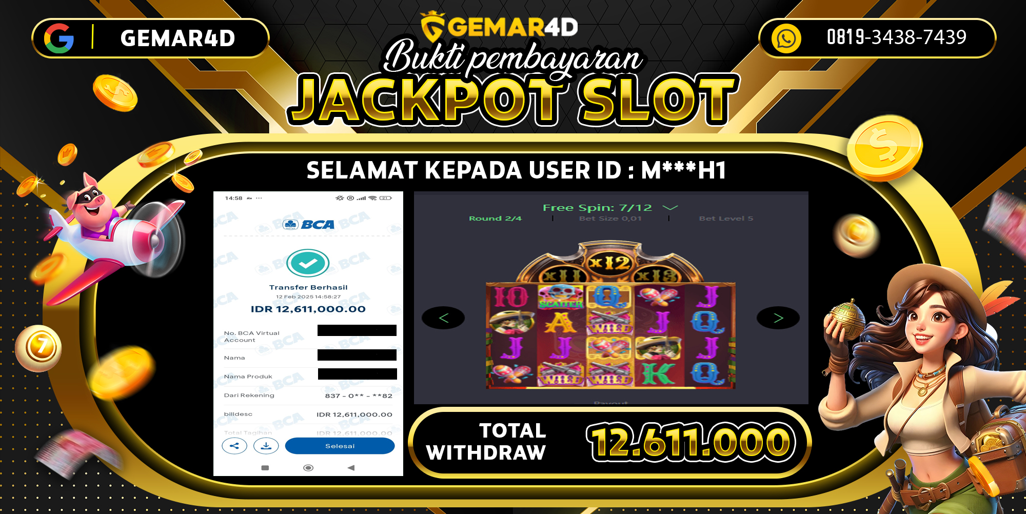 Selamat atas kemenangan User ID : M***H11, yang telah berhasil mendapatkan kemenangan di permainan SLOT WILD BANDITO dengan kemenangan sebesar Rp12.611.000,- . Setelah mengisi formulir withdraw, hanya dalam jangka waktu 2 – 5 menitan tim layanan pelanggan GEMAR4D telah berhasil mengirimkan semua saldo kemenangan ke User ID tersebut.