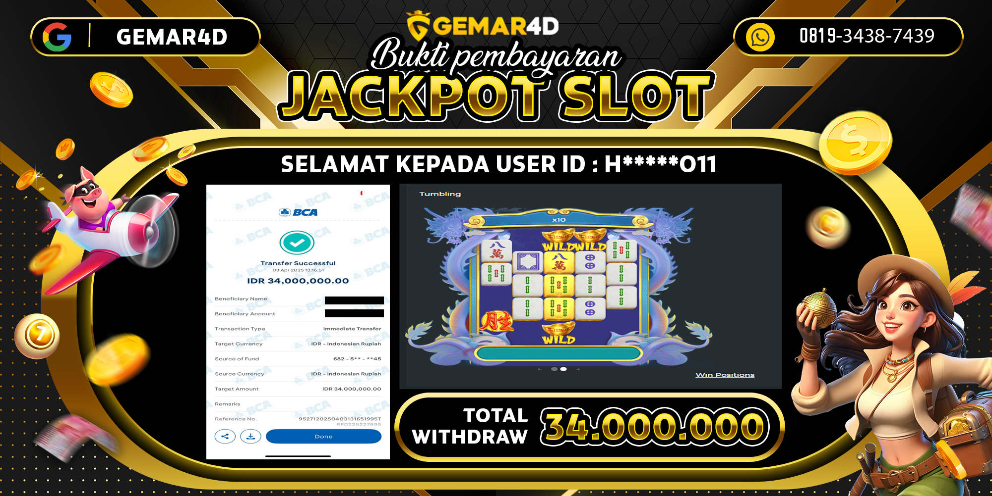 Selamat atas kemenangan User ID : H*****011, yang telah berhasil mendapatkan kemenangan di permainan SLOT MAHJONG WAYS 3 dengan kemenangan sebesar Rp34.000.000,- . Setelah mengisi formulir withdraw, hanya dalam jangka waktu 2 – 5 menitan tim layanan pelanggan GEMAR4D telah berhasil mengirimkan semua saldo kemenangan ke User ID tersebut.