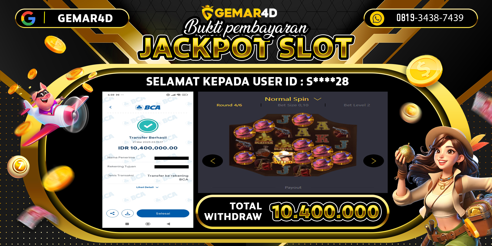 Selamat atas kemenangan User ID : S****28, yang telah berhasil mendapatkan kemenangan di permainan SLOT MAHJONG dengan kemenangan sebesar Rp10.400.000,- . Setelah mengisi formulir withdraw, hanya dalam jangka waktu 2 – 5 menitan tim layanan pelanggan GEMAR4D telah berhasil mengirimkan semua saldo kemenangan ke User ID tersebut.