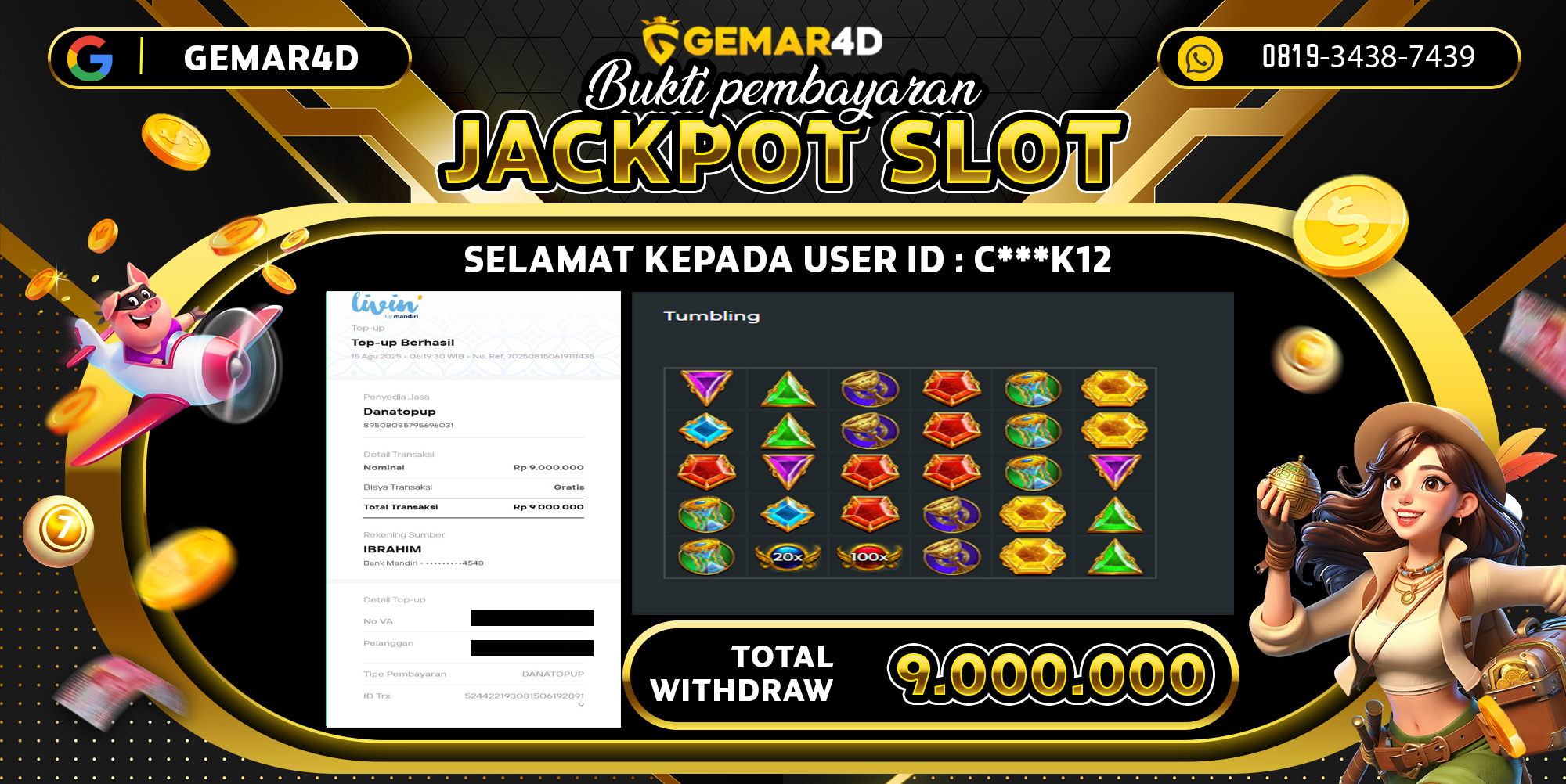 Selamat atas kemenangan User ID : C***K12, yang telah berhasil mendapatkan kemenangan di permainan SLOT GATES OF OLYMPUS dengan kemenangan sebesar Rp9.000.000,- . Setelah mengisi formulir withdraw, hanya dalam jangka waktu 2 – 5 menitan tim layanan pelanggan GEMAR4D telah berhasil mengirimkan semua saldo kemenangan ke User ID tersebut.