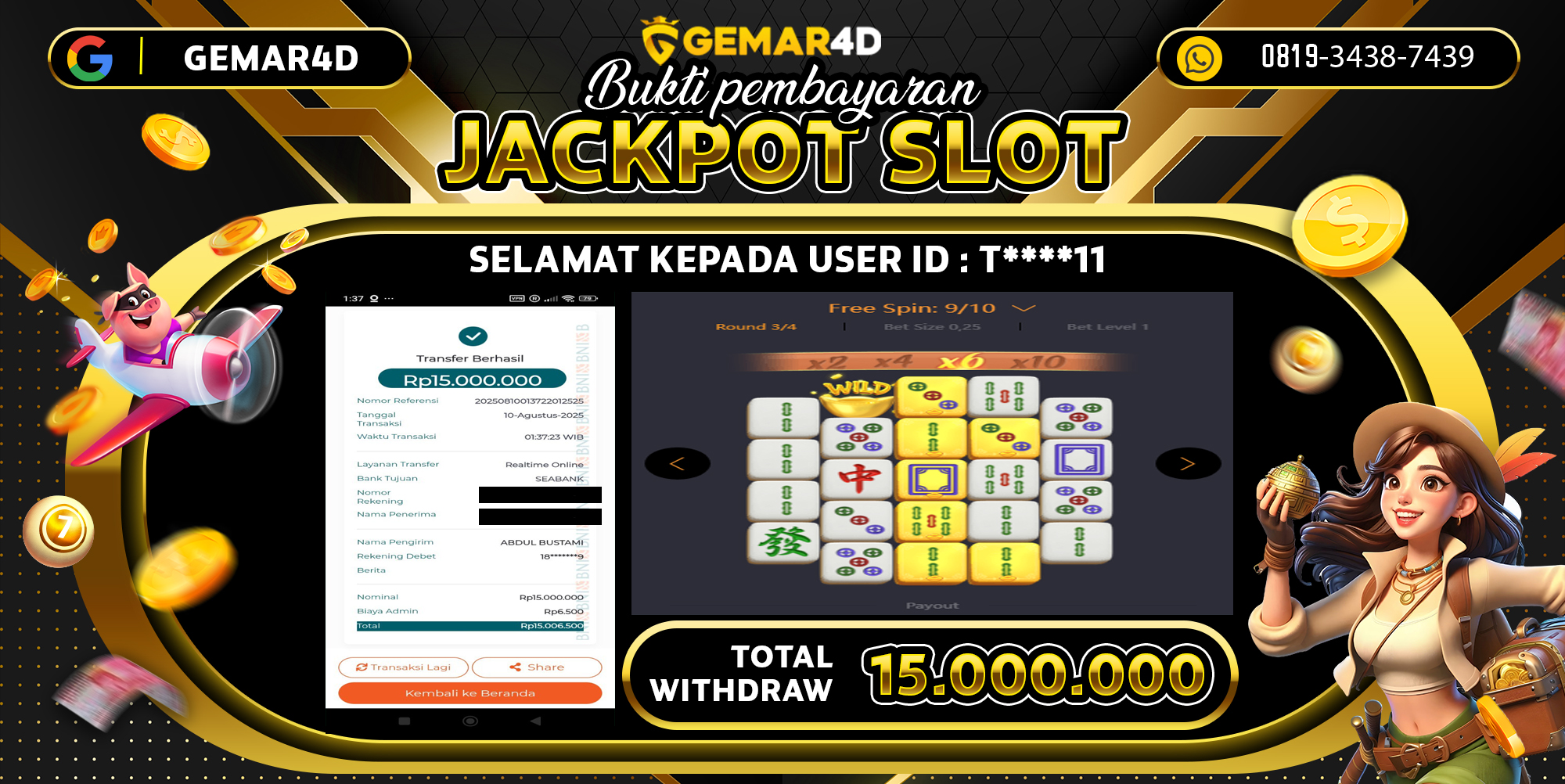 Selamat atas kemenangan User ID : T****11, yang telah berhasil mendapatkan kemenangan di permainan SLOT MAHJONG dengan kemenangan sebesar Rp15.000.000,- . Setelah mengisi formulir withdraw, hanya dalam jangka waktu 2 – 5 menitan tim layanan pelanggan GEMAR4D telah berhasil mengirimkan semua saldo kemenangan ke User ID tersebut.