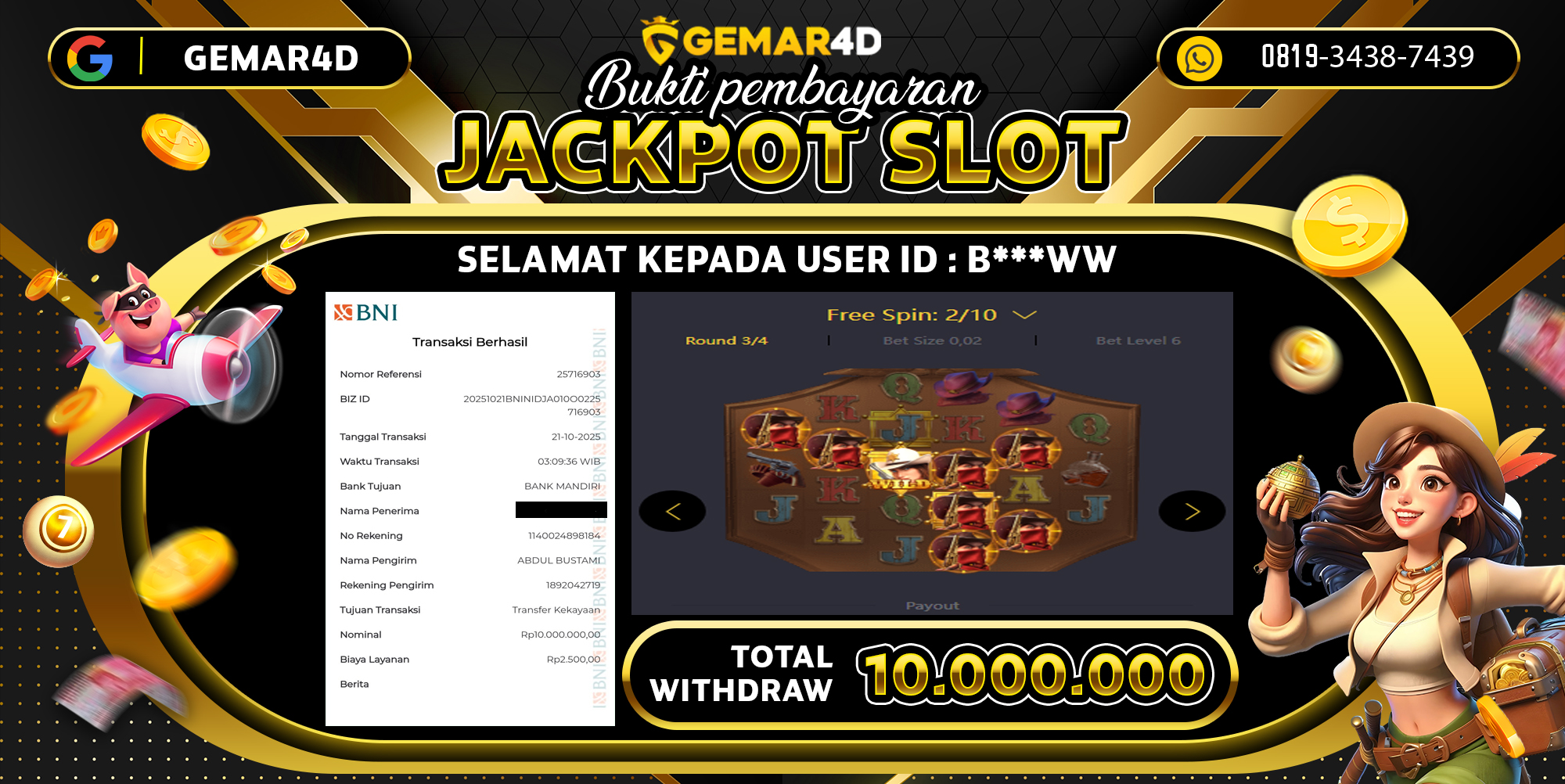 Selamat atas kemenangan User ID : B***WW, yang telah berhasil mendapatkan kemenangan di permainan SLOT MAHJONG dengan kemenangan sebesar Rp10.000.000,- . Setelah mengisi formulir withdraw, hanya dalam jangka waktu 2 – 5 menitan tim layanan pelanggan GEMAR4D telah berhasil mengirimkan semua saldo kemenangan ke User ID tersebut.