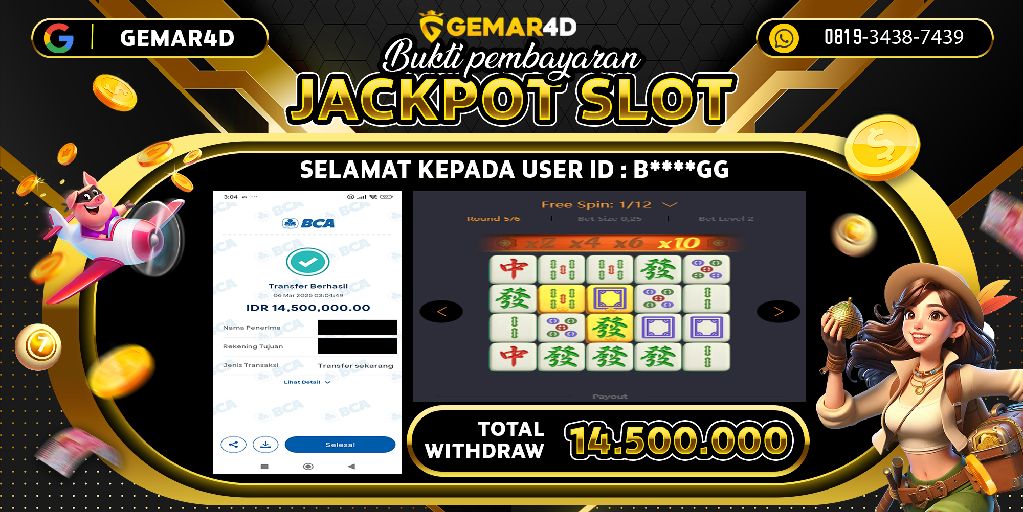 Selamat atas kemenangan User ID : B****GG, yang telah berhasil mendapatkan kemenangan di permainan SLOT MAHJONG dengan kemenangan sebesar Rp14.500.000,- . Setelah mengisi formulir withdraw, hanya dalam jangka waktu 2 – 5 menitan tim layanan pelanggan GEMAR4D telah berhasil mengirimkan semua saldo kemenangan ke User ID tersebut.