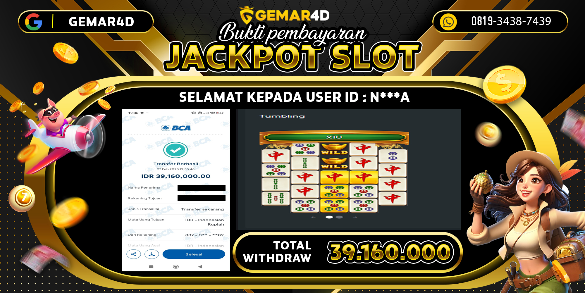 Selamat atas kemenangan User ID : N***A, yang telah berhasil mendapatkan kemenangan di permainan SLOT MAHJONG WINS 2 dengan kemenangan sebesar Rp39.160.000,- . Setelah mengisi formulir withdraw, hanya dalam jangka waktu 2 – 5 menitan tim layanan pelanggan GEMAR4D telah berhasil mengirimkan semua saldo kemenangan ke User ID tersebut.